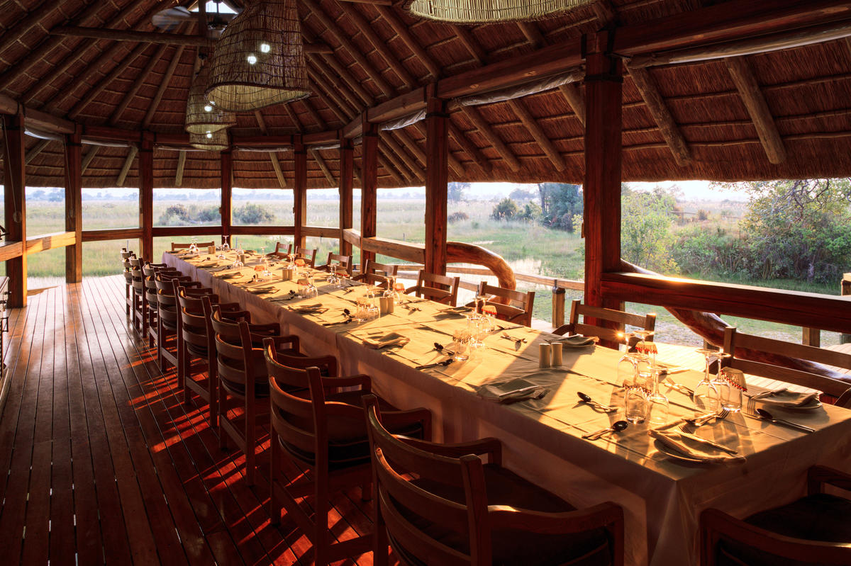 Das Hauptgebäude besitzt ein Dach aus Stroh und Schilf. Hier können Gäste des Camps die Zeit zwischen den Aktivitäten in der Cocktailbar, der Lounge (inkl. einer kleinen Auswahl an Literatur über die Tier- & Pflanzenwelt in Botswana), auf der Freiluftterrasse oder in der eigens angelegten Boma (traditioneller afrikanischer Rundbau) verbringen. Entspannung finden die Gäste auch in den schattig gelegenen Hängematten, auf dem Sonnendeck und in dem kleinen Swimming Pool, der – gerade während der heißen Mittagsstunden – für eine willkommene Abkühlung sorgt.